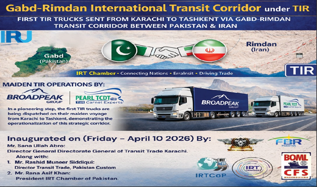 On Friday, April 10, 2026, the IRT Chamber proudly organized a historic ceremony at the BOML CFS Custom Terminal to inaugurate the Gabd-Rimdan International Transit Corridor under TIR. This landmark achievement marks a new era of regional connectivity and trade facilitation between Pakistan and Iran.