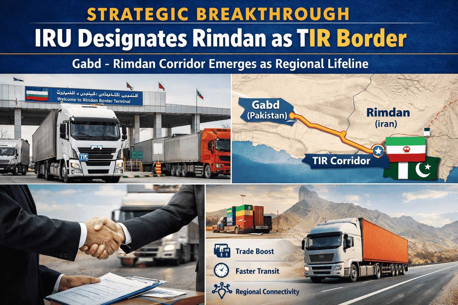 The designation of “Rimdan” (Iran) as a TIR-enabled international border crossing by the International Road Transport Union on 30 March 2026 marks a major milestone for regional connectivity and transit trade. This development establishes the Gabd (Pakistan) – Rimdan (Iran) corridor as a fully operational TIR route, unlocking new opportunities for Pakistan, Iran, and the Central Asian Republics (CARs).